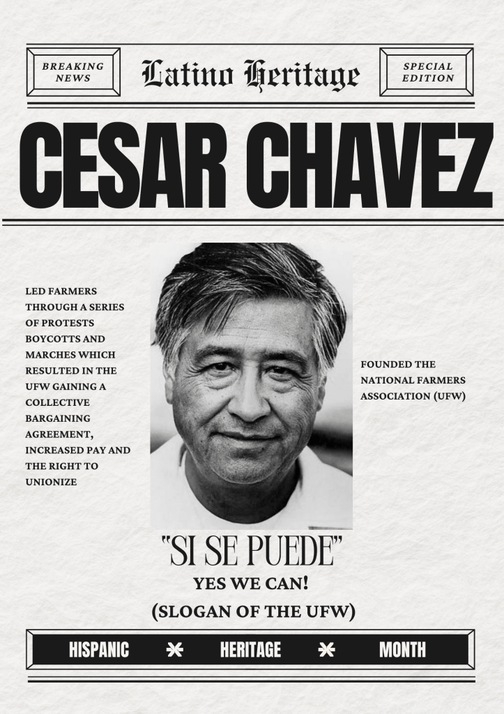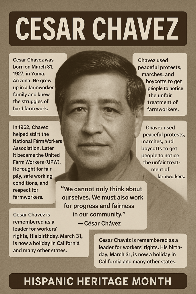 César Chávez (1927–1993) was a pivotal Mexican-American labor leader and civil rights activist celebrated during Hispanic Heritage Month for his tireless advocacy on behalf of farm workers. He is best known as the co-founder of the United Farm Workers (UFW) union, where he employed non-violent tactics—including boycotts, marches, and fasts—to fight for better wages, safer working conditions, and dignity for laborers, particularly during the landmark Delano Grape Strike and Boycott from 1965 to 1970. Chávez’s enduring legacy is captured in his famous rallying cry, “Sí Se Puede” (It Can Be Done), which continues to inspire activists today.